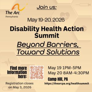 The Arc of Pennsylvania is hosting the 3rd Annual Disability Health Action Summit from May 19-20, 2026, in Camp Hill, PA. This is an in-person only event, taking place at the Penn Harris Hotel & Convention Center, with no option to attend virtually. Building on themes of health equity from previous years, this year’s summit pivots from identifying barriers toward developing sustainable solutions. Click here for the event schedule Click here to download a flyer